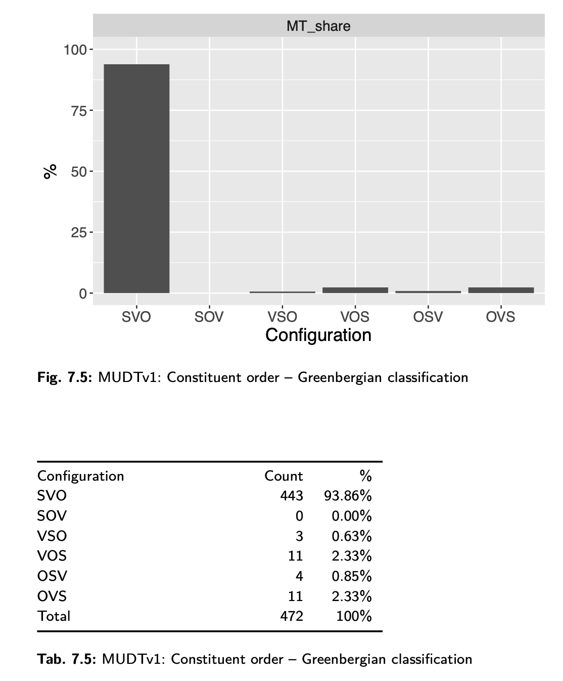 Now I am somewhat familiar with MUDT, seeing as I manually annotated the whole damn thing and then used it to get my PhD. In fact, a significant portion of my dissertation was dedicated to doing the exactly this kind of analysis - except I speak of "constituent order" - and my results were completely different. To compare, consider Fig. 7.5 and Tab. 7.5 from p. 190 (click to embiggen).